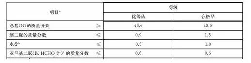 据了解,缩二脲含量超过1%时,不能作种肥、苗肥和叶面肥。在蔬菜瓜果作物上长期、连续施用尿素或含尿素复合肥易造成烧根、烂根等缩二脲中毒现象。据有关研究报道,柑橘类作物对缩二脲更为敏感,其积聚量超过0.25%就会导致叶尖发黄变脆、光合作用减弱,造成叶片早衰脱落,影响开花结果。从新标准可以看出,尿素等级从原来的三个等级减为两个等级,一等品等级被取消;合格品总氮(N)的质量分数由原来的≥46%变为≥45%,优等品的水分由0.4%变为0.5%。