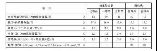 从新标准可以看出,农业用硫酸钾(颗粒状)合格品的水溶性氧化钾(K2O)的质量分数由原来的40%变为45%。粉末结晶状(合格品)的水分质量分数由原来的3%变为2%,颗粒状(合格品)的水分质量分数由原来的3%变为2.5%