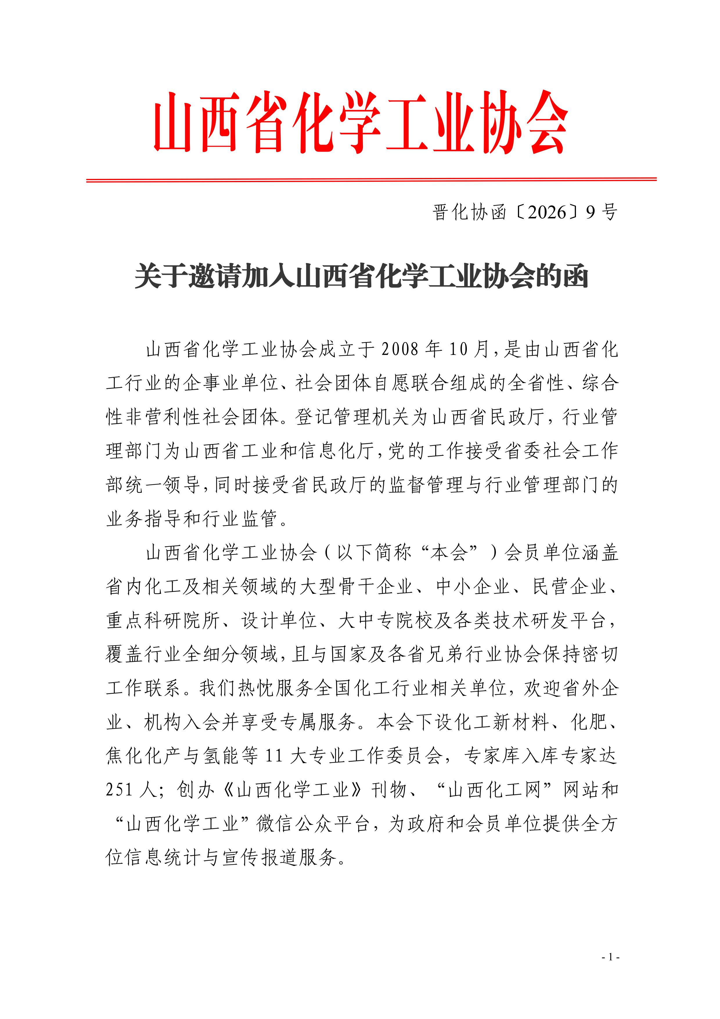 晋化协函〔2026〕9号 关于邀请加入山西省化学工业协会的函