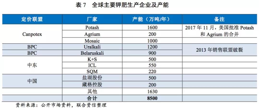 长期以来,国际钾肥市场一直由两大钾肥销售联盟所垄断和控制,分别为北美地区的Canpotex和东欧地区的BPC。Canpotex由北美三大钾肥生产商—加拿大钾肥公司(PotashCorp)、加拿大加阳公司(Agrium)和美国美盛公司(Mosaic)共同组建;BPC由俄罗斯的乌拉尔钾肥公司(Uralkali)和白俄罗斯钾肥公司(Belaruskali)共同组建,2012年两大联盟钾肥产能分别占全球的42%和33%。虽然国际钾肥供应充足,但两大联盟通过限产保价等策略维持了钾肥市场的价格繁荣。2013年,全球第二大钾肥生产企业俄罗斯乌拉尔钾肥公司宣布退出BPC,全球第二大钾肥销售联盟破裂,钾肥价格大幅下滑50%至200美元/吨。