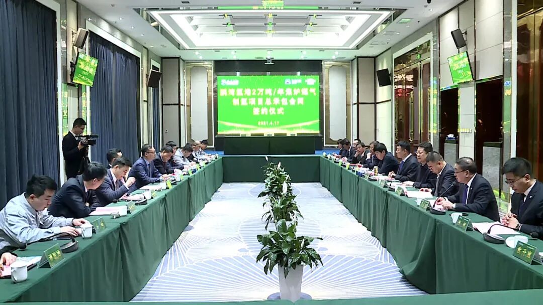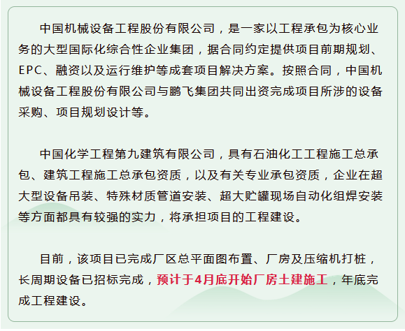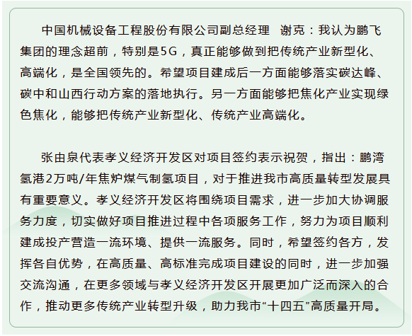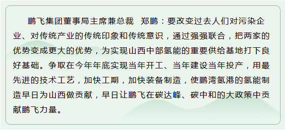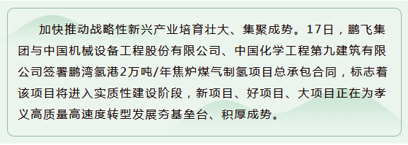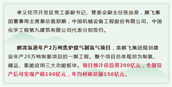鹏湾氢港氢能产业园项目,是由鹏飞集团和美国海湾环境系统公司合作建设的氢能综合利用产业园项目,投资百亿元,设计规模为年产20万吨氢气,分三期建设,釆用焦炉煤气制氢为主,煤制氢为辅的制氢模式,规划建设集制氢、储氢、加氢、运氢及下游产业、研发于一体,打造在全省乃至全国有影响力的氢能产业示范基地,项目主要产品为气态氢气和以甲基环己烷为载体的“有机液态氢气”,可广泛应用于石油炼制、冶金工业、氢燃料汽车等领域。