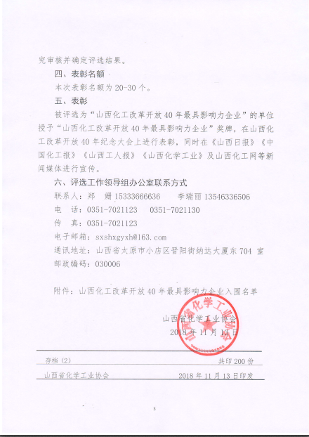 由山西省化学工业协会成立“山西化工改革开放40年最具影响力企业”评选工作领导组,负责本次评选工作,设立评选办公室,负责推荐评选表彰的具体工作。