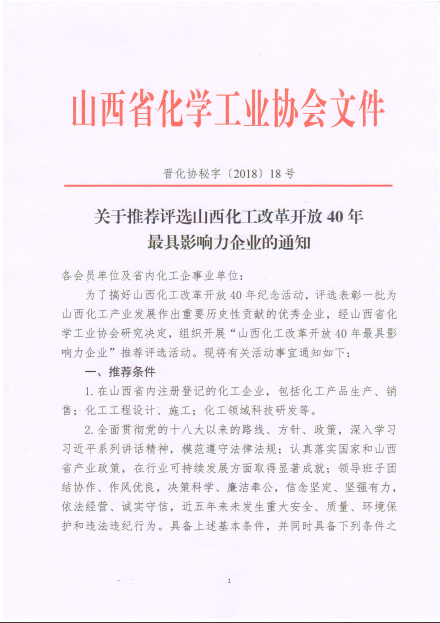 为了搞好山西化工改革开放40年纪念活动,评选表彰一批为山西化工产业发展作出重要历史性贡献的优秀企业,经山西省化学工业协会研究决定,组织开展“山西化工改革开放40年最具影响力企业”推荐评选活动。现将有关活动事宜通知如下: